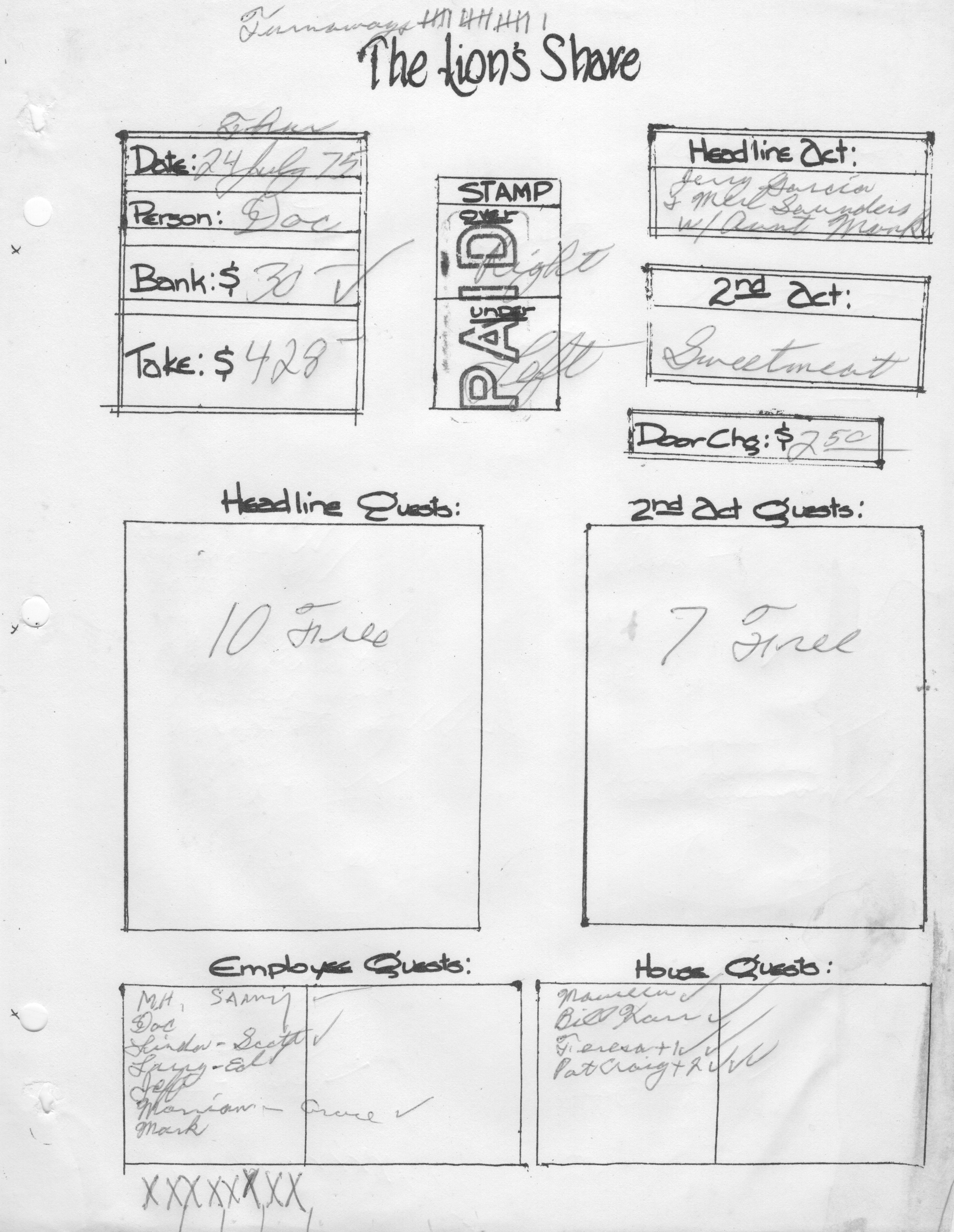 JGBP comment to JGMF "This from "cabdriver' in the Jerry folder at Deadnetcentral: "This Lion's Share gig (their closing week) was the first week of July, 1975.(week not correct) The Garcia-Saunders Band played two nights; the last night featured Elvin Bishop and John Lee Hooker. Along with Hooker doing his patented take-no-prisoners thing, Bishop and a couple other guitar players pulled of a sublime version of "East-West" in the closing set." I'm still trying to find the exact closing date for the Lion's Share, it was some time in 1975. I saw/heard Garcia & Saunders play on two consecutive nights there, during closing week. There were not very many people there, that's the funny part. And I can't find any reference to them doing those gigs anywhere. But it did really happen!"