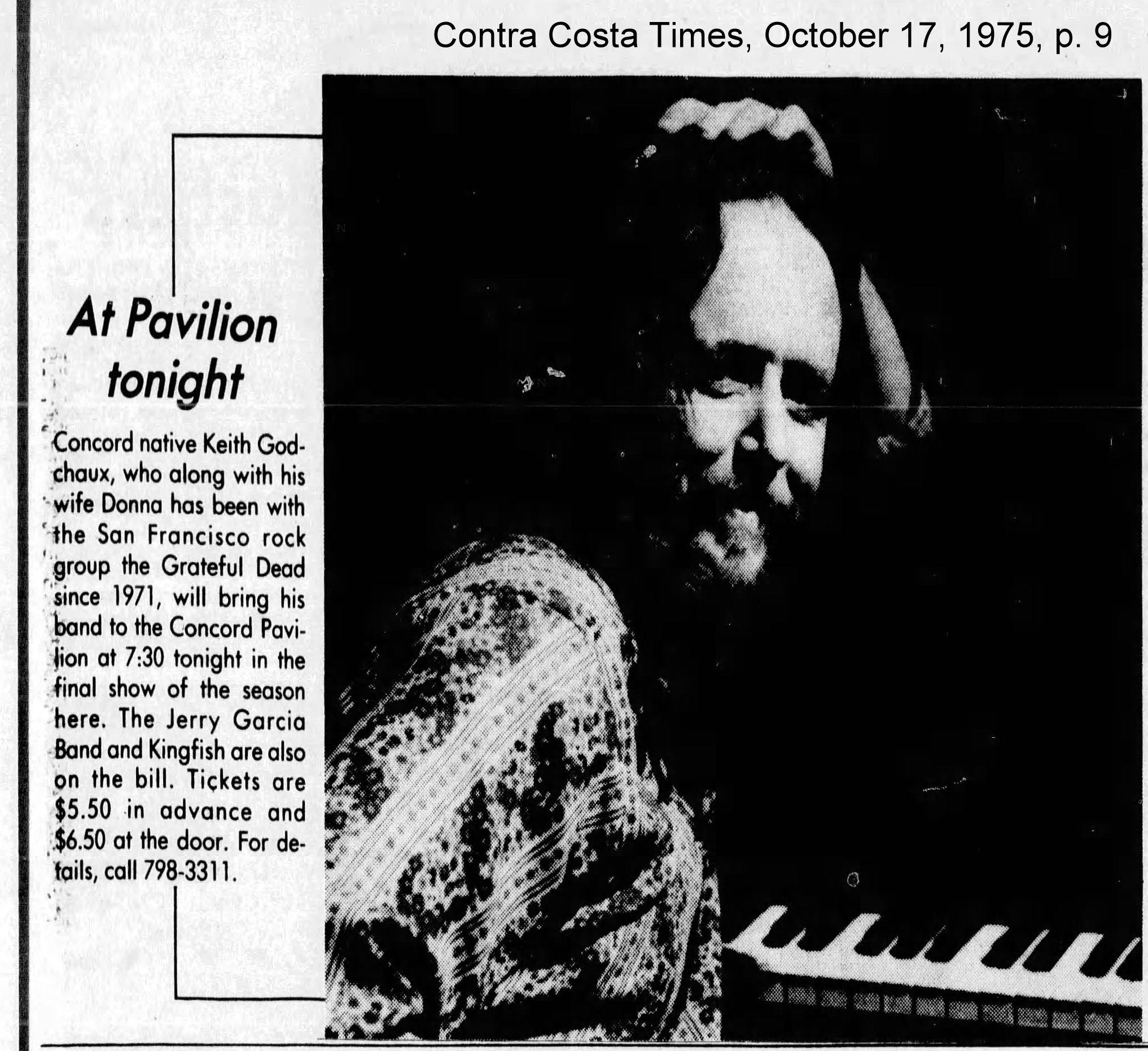 caption: "At Pavilion tonight," Contra Costa Times, October 17, 1975, p. 9. Picture of Concord native Keith Godchaux