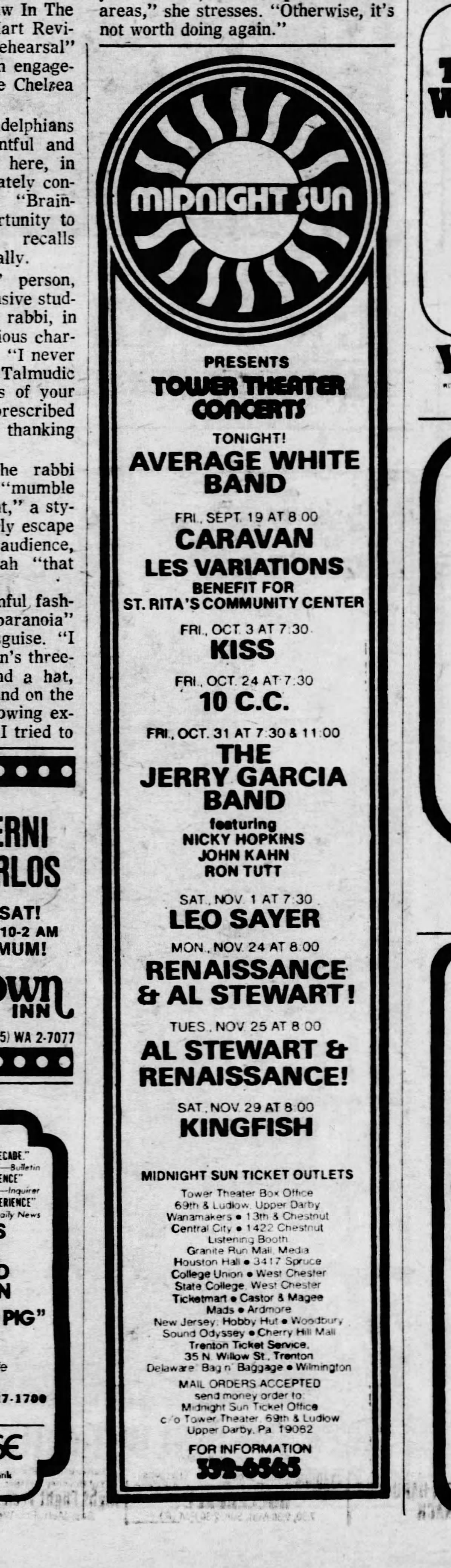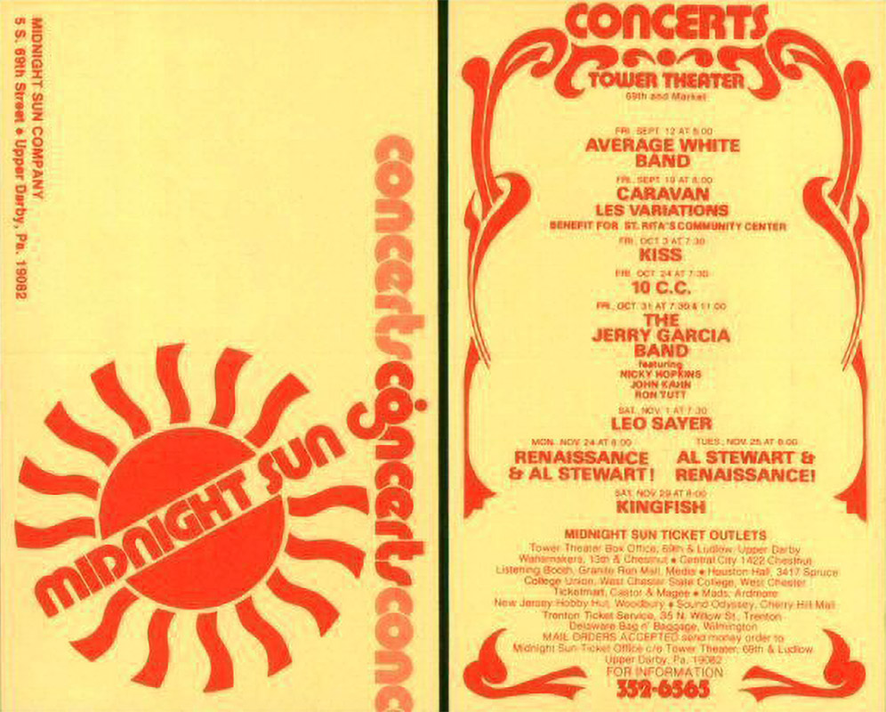 previews: Lancaster Independent Press, October 24, 1975, p. unk | "Lily Tomlin always good for laughs," Bucks County Courier-Times, October 26, 1975, p. C14 | Phil Ceccola, "It's a Music Lover's Week," Philadelphia Inquirer, October 26, 1975, p. unk | "Jerry Garcia Haunts Tower," Juniata Gazette, October 29, 1975, p. unk | "Gone Fishing?" Villanovan, October 29, 1975, p. 11