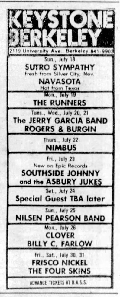 ads: San Francisco Sunday Examiner and Chronicle Datebook, July 11, 1976, p. 45; San Francisco Sunday Examiner and Chronicle Datebook, July 18, 1976, p. 43 (showing Rogers and Burgin opening)