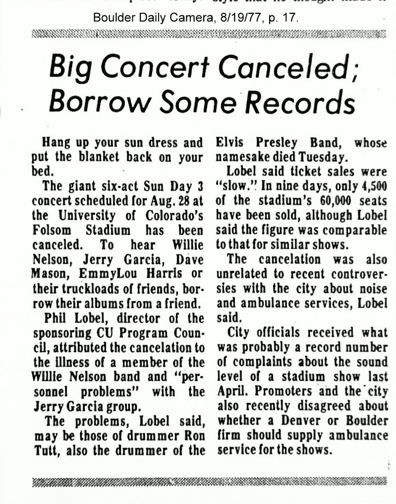 cxl: "Big Concert Canceled; Borrow Some Records," Boulder Daily Camera, August 19, 1977, p. 17
