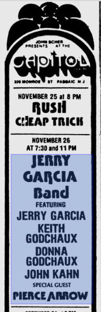 ads: The Record (Hackensack, NJ), November 13, 1977, p. B27 |Village Voice, November 28, 1977, p. unk, via Google News ( billing "Jerry Garcia Band, featuring Jerry Garcia, Keith Godchaux, Donna Godchaux, John Kahn", plus "special guest Pierce Arrow")