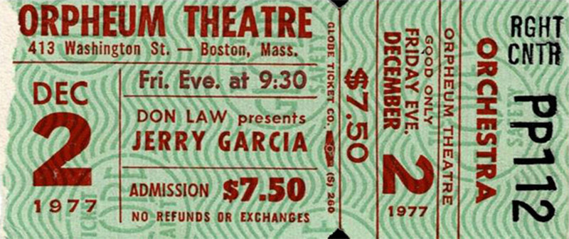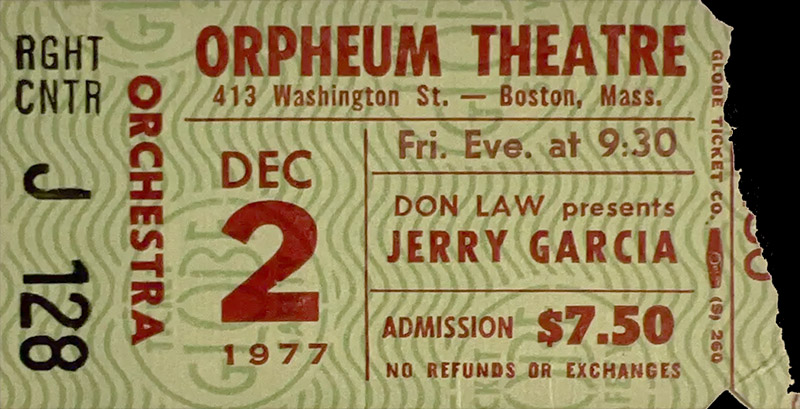 TJS contributor Pat Daly (11/20/2012) provided a 9:30 ticket with this recollection: "Long story short, Jerry got a late start and had to cram in 6 songs before the midnight curfew – resulting in the shortest - but by far most incendiary – Jerry-related show I ever attended." So the late show was ticketed for 9:30 pm but over by 12.