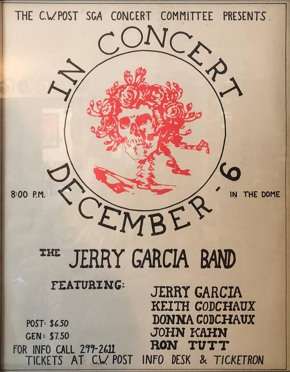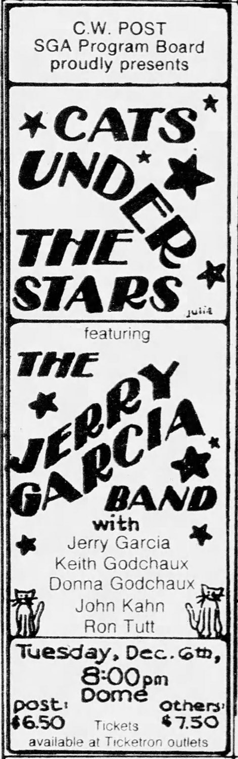 expost: McClusker 1977: Jerry and gang acted like prime donne. Contracts rolled in late. (There is some evidence of revision on the contracts we have seen.) JG demanded 60 backstage passes, $600 for food (Cy Kocis – see also 11/29/77). Mike Bronzino, Concert Chairman, refused to give in on the last. Lloyd Kupferman, Chairman of the Program Board, "was literally knocked on the floor as a result of a blow from one of Garcia's crew, because of a difference of opinion". JG showed up in his limo at 6:30, then left immediately, complaining his room was too hot, brushing past staff with a "get the fuck out of my way". "We expected Jerry Garcia," Bronzino said, "but what we got was Marilyn Monroe".