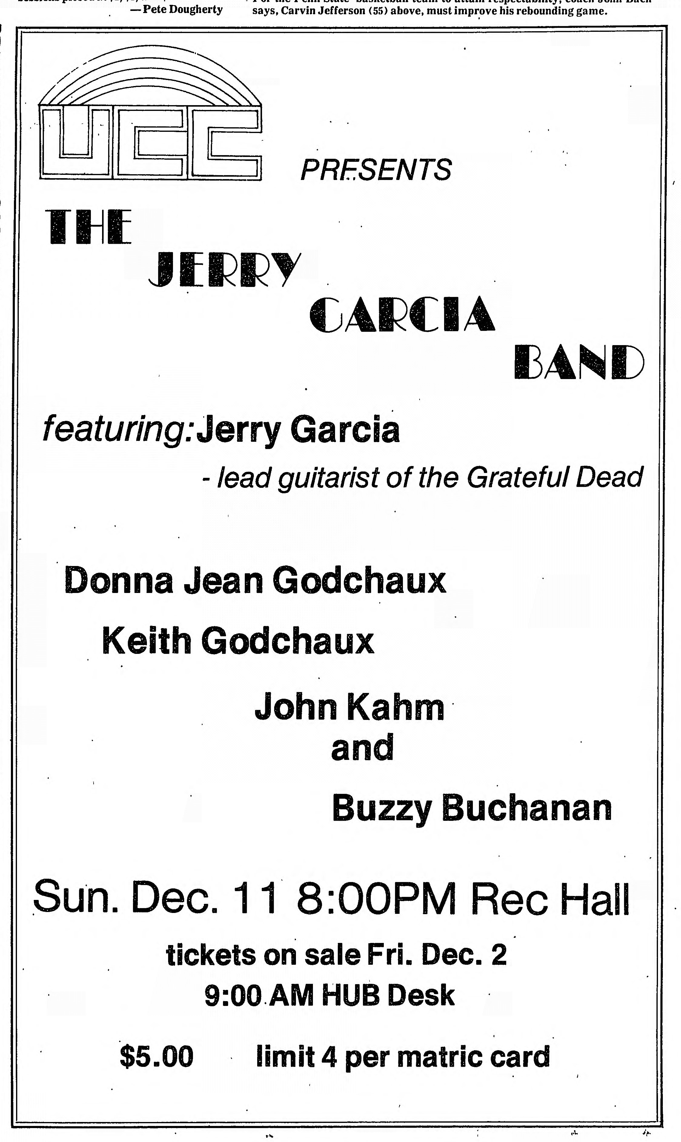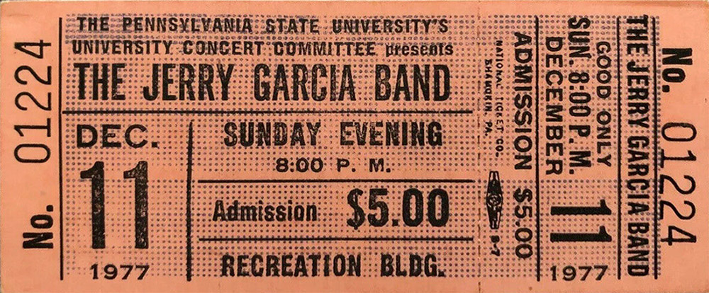 exante: Nancy Huff, "WAR may hit University Park," Daily Collegian, October 10, 1977, p. 3 (first mention of possible JGB visit to campus that fall) | "Jerry Garcia Band to perform," Daily Collegian (Penn State University), December 9, 1977, p. 3 ("According to Rob Harris, Chairman of the University Concert Committee, there are still many tickets available") | Clifford 1977