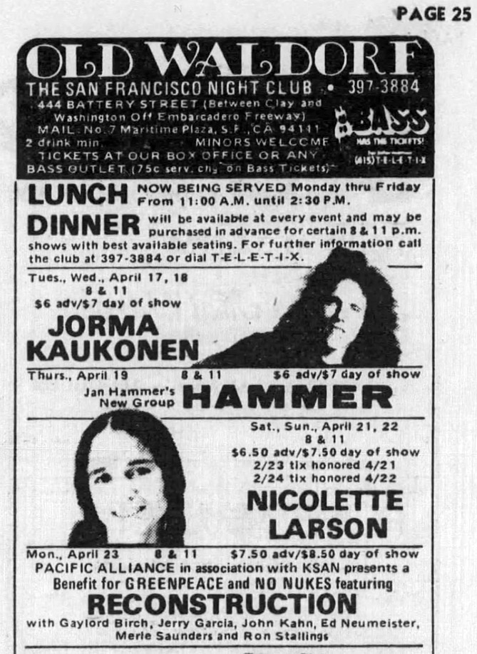 Greenpeace 'No Nukes' Benefit at the Old Waldorf: Reconstruction, April 23, 1979