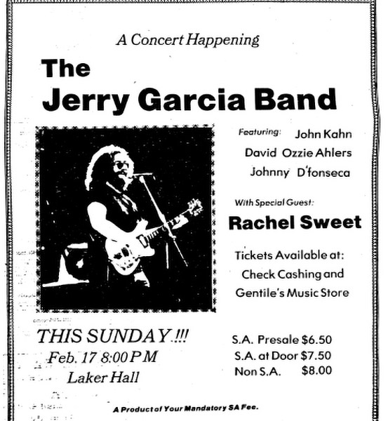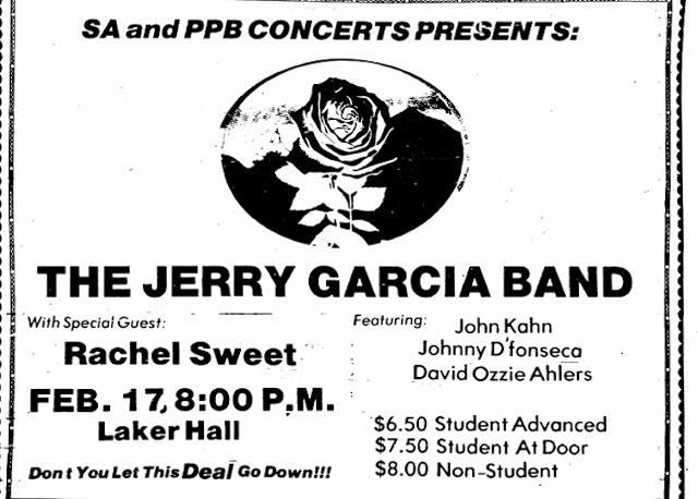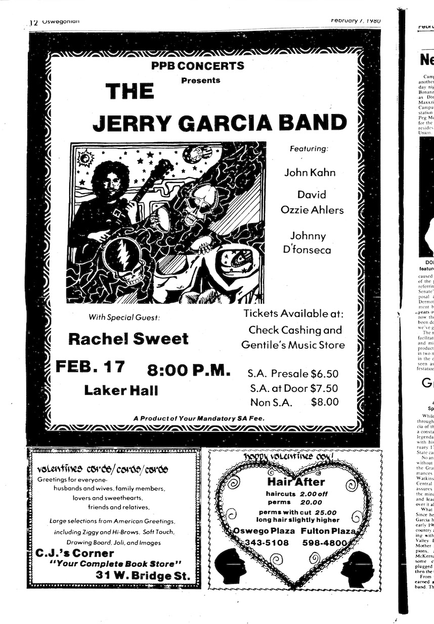 preview: Finn and Donoghue 1980; condensed version appeared as preview: "Jerry Garcia Band to Play at Laker Hall," Pulaski Democrat, February 13, 1980, p. 12