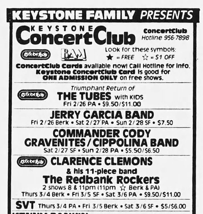 review: [positive] Haerle 1982. This kid is fired up, even as he misidentifies keyboard player as Merle [sic] Saunders, and bassist as Steve Kahn. "At some point around 11:05, the unmistakable sound of Garcia tuning up began emanating from behind the curtain. The audience was beginning to get anxious. They had timed their drugs perfectly. ... Garcia grabbed members of the audience by the medulla oblongata and pulled them onto the dance floor, one by one. ... Garcia plays for the audience and the sheer enjoyment of making music".