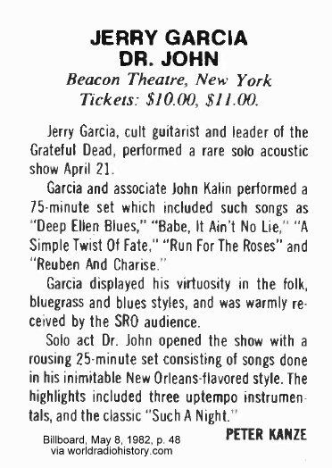 ref: Roman Kozak, "John Scher Moves East of Hudson," Billboard, April 24, 1982, p. 44; Kozak notes that this ends the de fact arrangement whereby Scher stayed West of the Hudson and Ron Delsener owned NYC. This was a big move for John Scher, and it's not surprising that Jerry would help him make it - they were very close, and their careers advanced together. See JGMF, Jerry Garcia and John Scher.