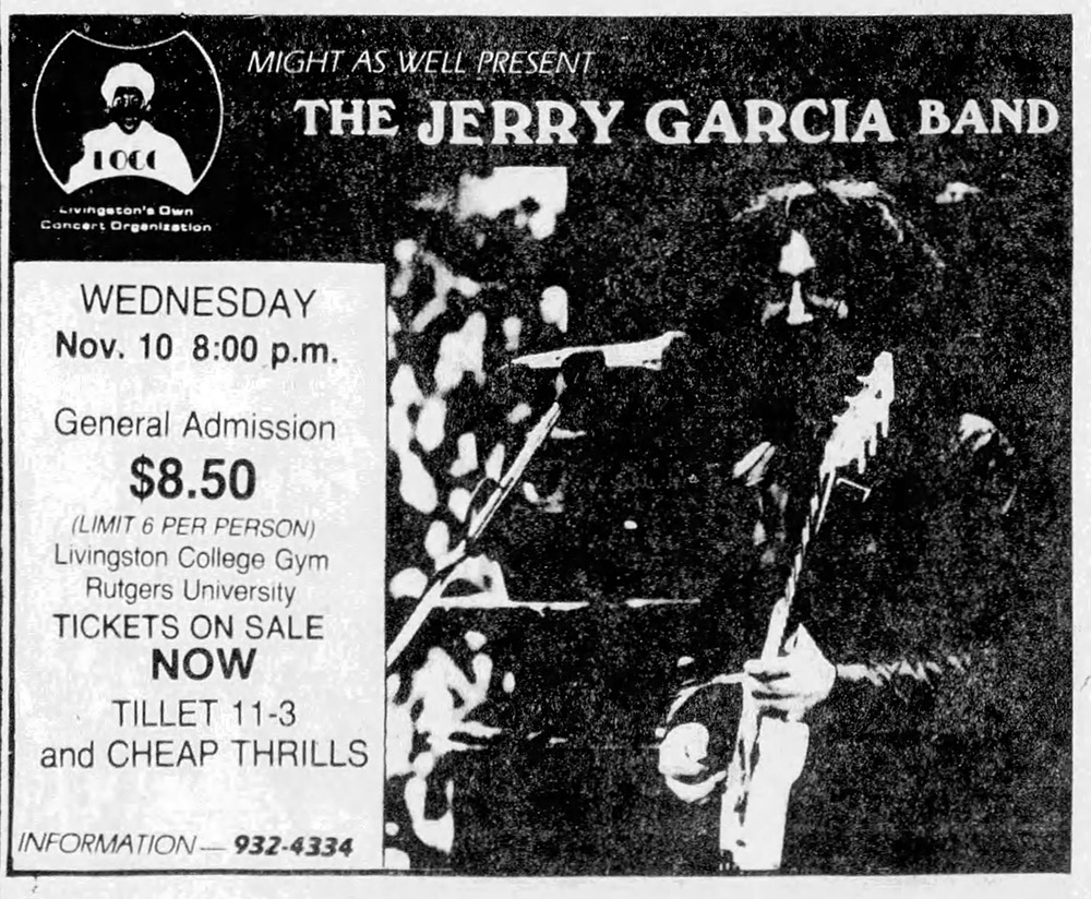 commenter at JGBP: "Presented by L.O.C.O. ie Livingston's own concert organization. Garcia Band contract was for 25K." The former may be right, but the latter is not. Per Sue's data, guarantee was $10k, on 3,100 capacity @ $8.50 tickets (GP $26,350), plus 90% gross gate receipts after tax over $24,707 plus 100% difference between estimated non-variable expenses of $22,461 and actual expenses, plus $4,000 production fee, plus 10% Monarch booking fee.