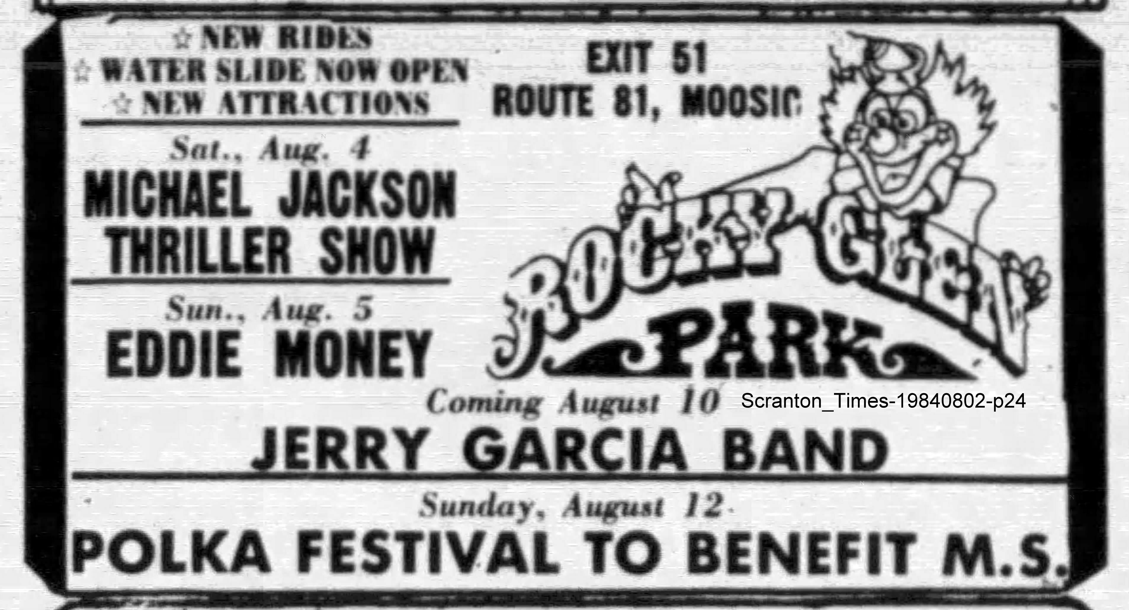 review: [positive] Marcus 1984: "Under a tin roof on a pier jutting out into the lake at Rocky Glen", JGB touched the X-factor. The exclusive ticketing agent for the show in Scranton sold only 150 tickets, but the place was packed with out-of-towners. He says the backing singers were the same from the last tour, but we are reasonably certain that is not correct.