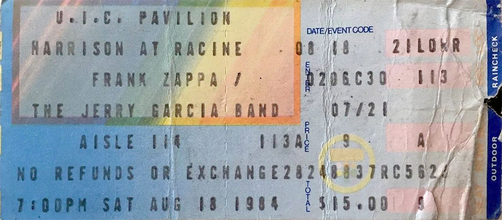 review: [positive] Van Matre 1984: says the opening / closing slots were determined by a coin flip, with Zappa headlining. [He got the ad imagery before the fact, too.] Van Matre likes both of the "aggressively unfashionable" acts, finding Garcia "capable of conjuring up a kind of sweet, stoned, meandering magic with his music that has lasting appeal".