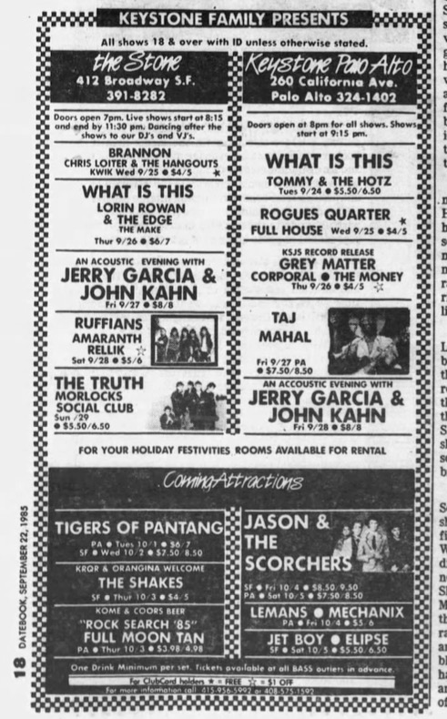ad: San Francisco Examiner Datebook, September 22, 1985, p. 18.