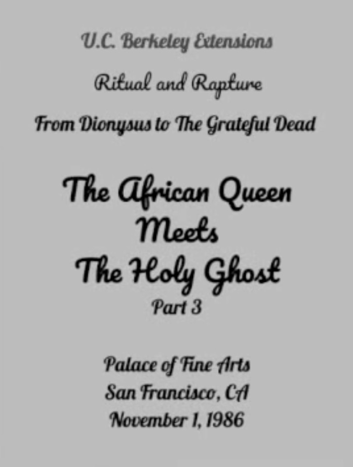 dead.net: Documenting The Dead: Joseph Campbell and the Grateful Dead a symposium called “Ritual and Rapture, From Dionysus to the Grateful Dead.” Sponsored by UC Berkeley Extension, the day-long event was held on November 1, 1986 at San Francisco's Palace of Fine Arts and featured talks by Campbell and Jungian analyst John Perry along with a performance by Hart and others called “The African Queen Meets the Holy Ghost.”