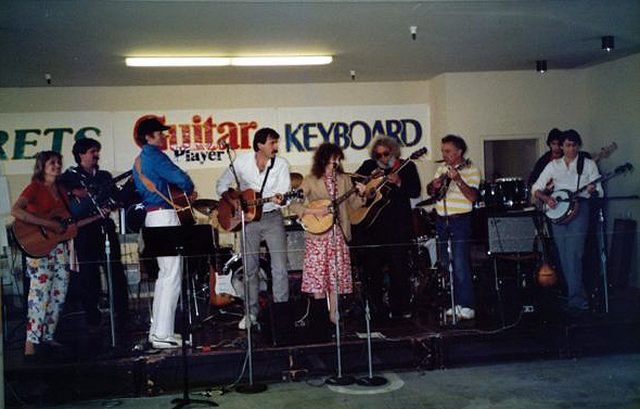 "Garage Jam" at the offices of Guitar Player magazine. Garcia played a borrowed Strat during the electric set (Jon Sievert oral history 1/16/2008). A now defunct web site [Accent on Music] site listed most of the players we show (others from Hilburn 198), and narrated "As we recall, we played about a half-hour set that included Grateful Dead and Beatles tunes."