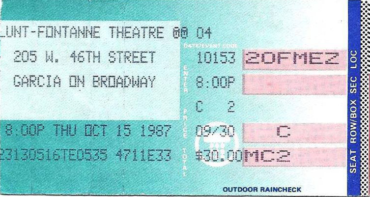 Regarding Garcia on Broadway personnel, we have not pinned down nights when Kenny Kosek (fiddle) played w JGB, though we know he was not present for 10/28/87a.