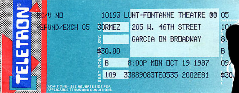 Regarding Garcia on Broadway personnel, we have not pinned down nights when Kenny Kosek (fiddle) played w JGB, though we know he was not present for 10/28/87a.