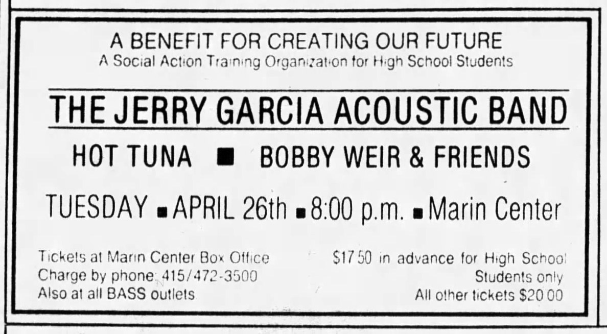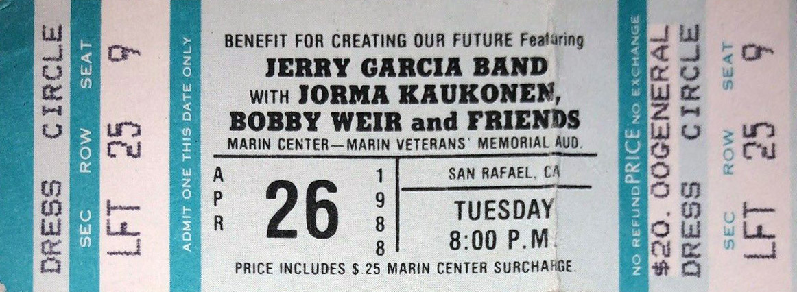expost: Jimbo Juanis, "Bay Area Bits," Relix, 15, 4 (August 1988): 42. "Creating our Future is a social action training program for high school students with the goal of a shared vision of the world at peace. It was the idea of Sat Santokh Singh Khalsa, a follower of the Sikh religion, who under his previous name of Burt Kanegson, was a business manager of The Grateful Dead from 1967 to 1969. ... The sold out show raised about $20,000 for a most worthwhile endeavor."
