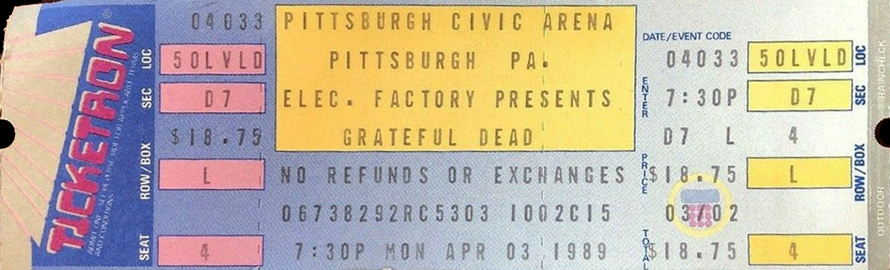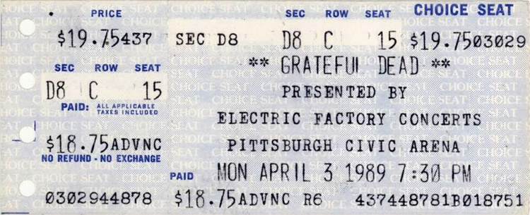 From jaybrug on dead.net: This whole Pittsburgh scene was total chaos. Wasn't long after this that they stopped letting us camp on site. The village was huge here, penetrating into the surrounding neighborhoods (the infamous Hill District). Deadheads owned the city, way more people showed up than "The Igloo" could accommodate. Redneck cops, actually taunting us like some high school bully, rainy weather and an ignorant Sophie Masloff referring to us as "Dead Enders" couldn't break our spirits.