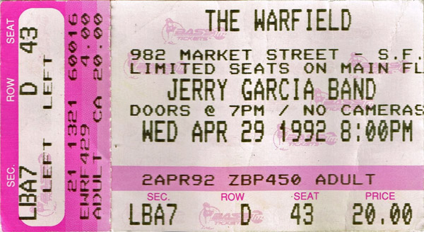 JERRY GARCIA BAND 4-29-1992 WARFIELD THEATER SAN FRANCISCO CA