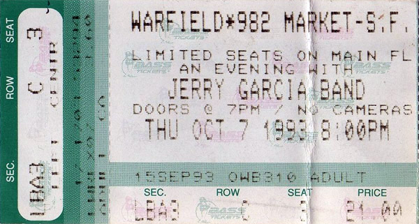 JERRY GARCIA BAND 10-7-1993 WARFIELD THEATER SAN FRANCISCO CA