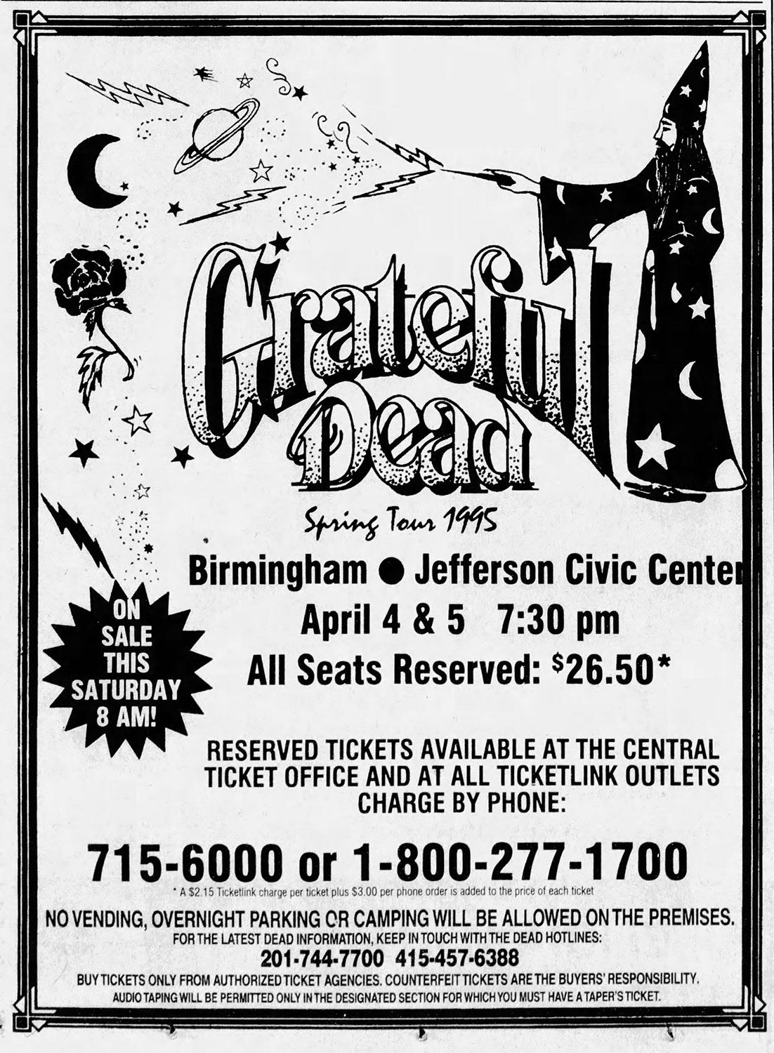 via reddit Donna Jeam AMA, One of these Birmingham mornings, Jerry had breakfast with Donna Jean. "Just a few months before he passed, the Grateful Dead were playing in Birmingham, and I went down there and saw the band and had breakfast with Jerry the next morning. We went over old times and laughed together."